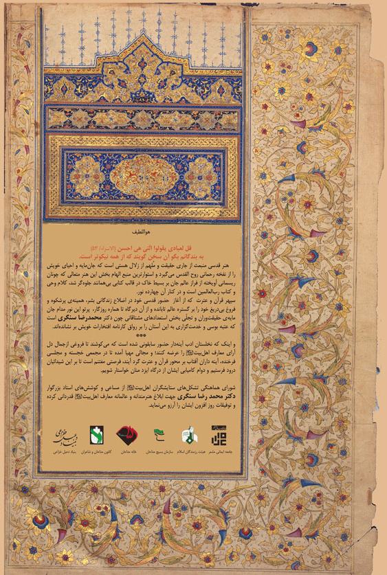 هنر قدسي منبعث از جاري حقيقت و مُلهم از زلال هستي است كه جانمايه و احيای خويش را از نفخه رحماني روح القدس ميگيرد و استوارترين منبع الهام بخش اين هنر متعالي كه چونان ريسماني آويخته از فراز عالم جان بر بسيط خاك در قالب كتابي بيهمانند جلوهگر شد، كلام وحي و كتاب رب العالمين است و در کنار آن چهارده نور.