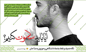 در بخش هیئت، بهنام حمیدی در مطلبی با عنوان « آیا باید سکوت کنیم » می نویسد : « از دیگر مشکلات و معضلات جامعۀ مداحی امروز نگاه ضعیف و غلط جامعۀ علمی، دانشگاهی و حوزوی ما به قشر مداحان است مداحان را افراد بی سواد، کم علم و بی تجربه می دانند در حالی که در جامعۀ مداحی کشور افراد نخبه و چهره های علمی برجسته وجود دارد»