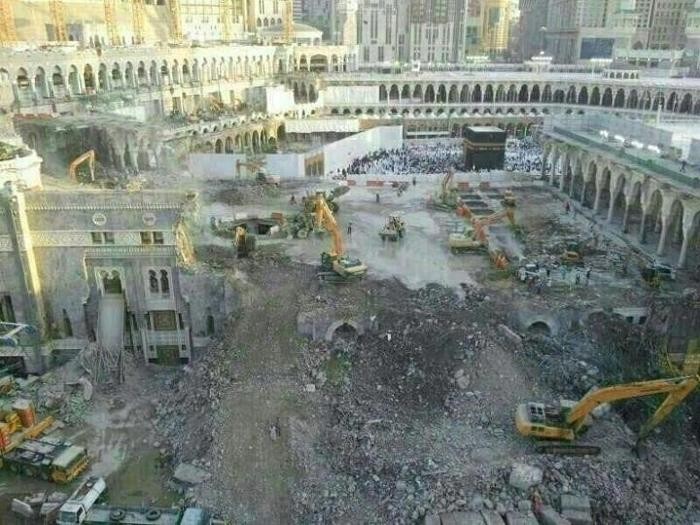 بسیاری با حیرت به تخریب صدها بنای تاریخی و یادبود به منظور گسترش مسجدالحرام مینگرند. بر طبق گزارش مؤسسه خلیج در واشنگتن، بیش از ۹۵ درصد از ساختمانهای هزارساله مکه تخریب شده تا به جای آن هتلهای لوکس، آپارتمانها و مراکز خرید ساخته شود.